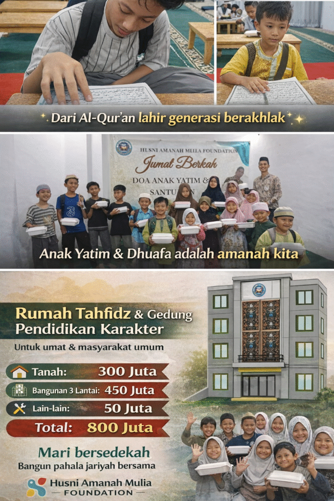 Mari bersama kita wujudkan Rumah Tahfidz dan Gedung Pendidikan Karakter Al Husni sebagai tempat lahirnya generasi penghafal Al-Qur’an, berakhlak mulia, dan bermanfaat bagi umat.